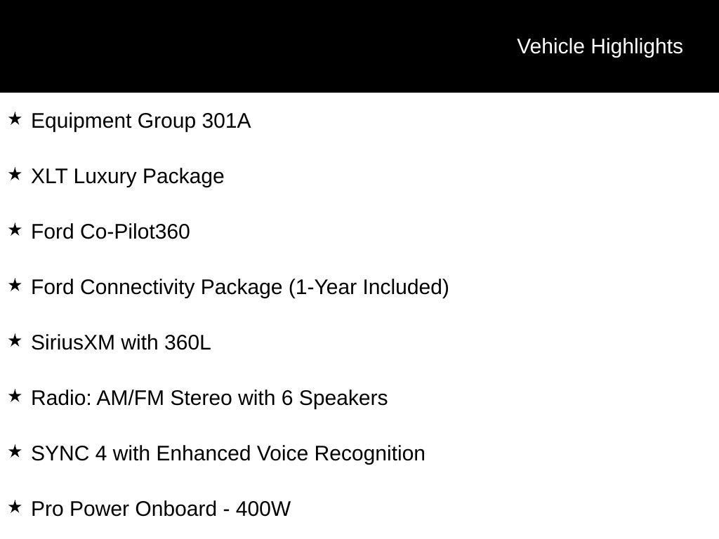 - Package Features: Equipment Group 301A, Ford Co-Pilot360, Ford Connectivity Package (1-Year Included), XLT Luxury Package