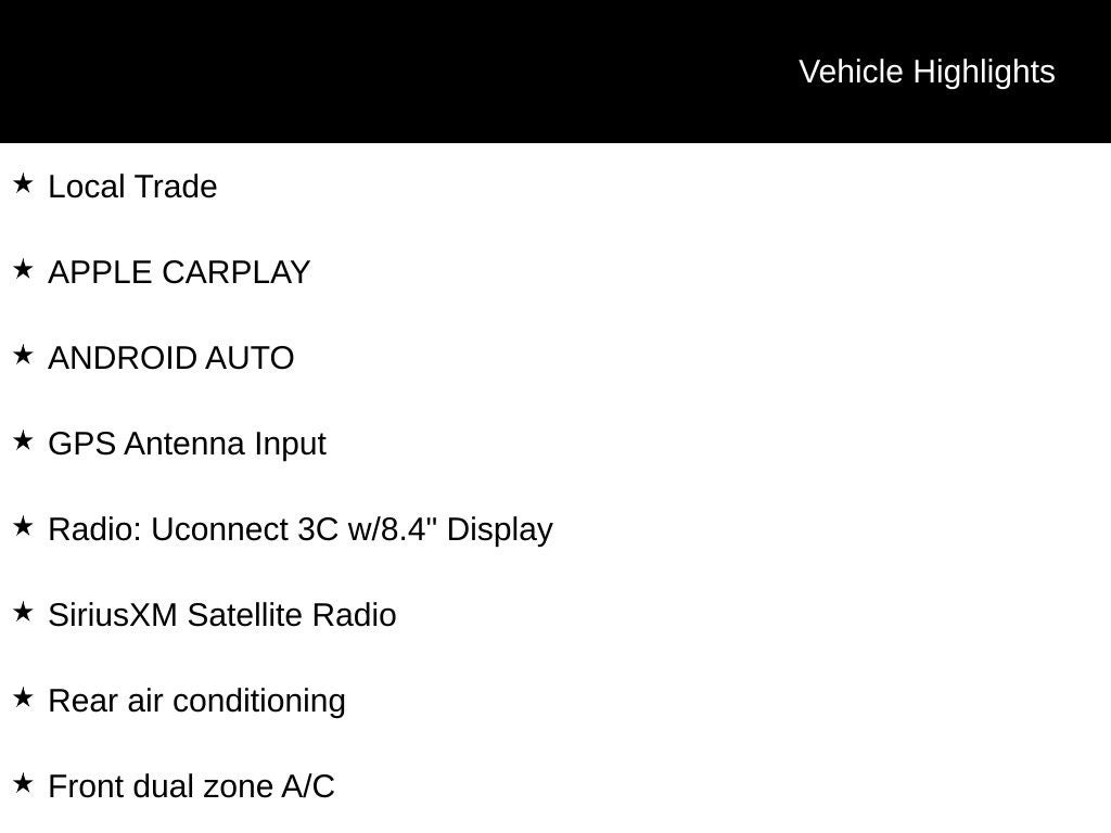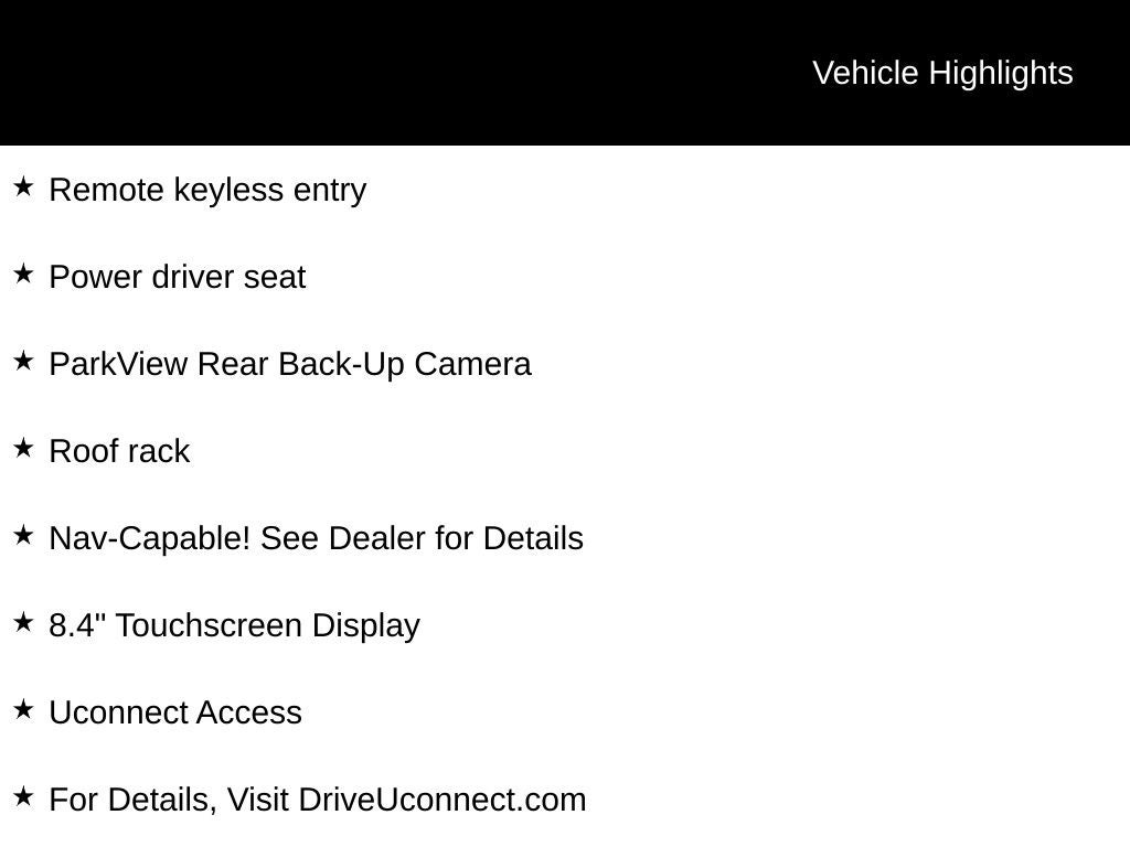 - Radio: Uconnect 3C w/8.4 Display, Nav-Capable, Uconnect Access