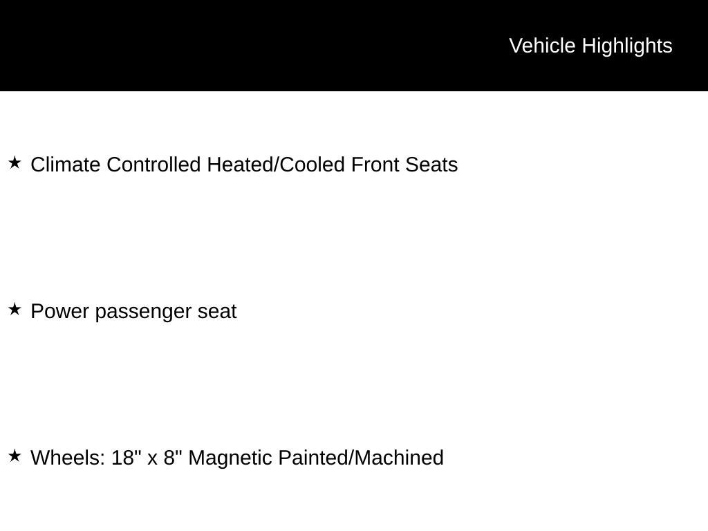 - Wheels: 18" x 8" Magnetic Painted/Machined