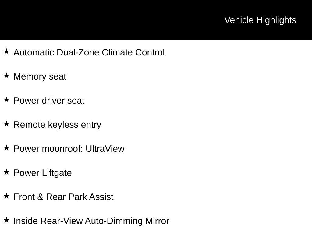 - Sunroof, power UltraView double-sized glass roof that opens over first row, tilt-sliding with Express-Open and power sunshade