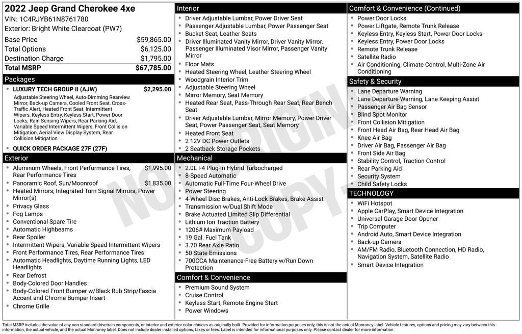 Bright White Clearcoat 2022 Jeep Grand Cherokee 4xe 4WD 8-Speed Automatic 2.0L I4 DOHC Low Miles!!!, Local Trade!!!, Apple CarPlay/Android Auto, Clean CarFax!!!!, Grand Cherokee 4xe Base, 4D Sport Utility, 4WD, 10 Speakers, 10.1 Touchscreen Display, 2nd-Row Manual Window Shades, 4G LTE Wi-Fi Hot Spot, All Radio Equipped Vehicles, AM/FM radio: SiriusXM with 360L, Apple CarPlay, Auto High-beam Headlights, Auto-Dimming Exterior Driver Mirror, Automatic temperature control, Brake assist, Capri Leather Seats w/Perforated Inserts, Connected Travel & Traffic Services, Connectivity - US/Canada, Disassociated Touchscreen Display, Dual-Pane Panoramic Sunroof (DISC), Electronic Stability Control, For Details, Visit DriveUconnect.com, For More Info, Call 800-643-2112, Front dual zone A/C, Front fog lights, Front Passenger Interactive Display, Fully automatic headlights, Global Telematics Box Module (TBM), Google Android Auto, GPS Antenna Input, GPS Navigation, HD Radio, Heated front seats, Heated rear seats, Integrated Center Stack Radio, Integrated Off-Road Camera, Integrated Voice Command w/Bluetooth®, Intersection Collision Assist System, Luxury Tech Group II, Memory seat, Memory Steering Column, Panic alarm, ParkSense Front/Rear Park Assist w/Stop, ParkView Rear Back-Up Camera, Passive Entry - Front/Rear Doors, Liftgate, Power driver seat, Power Liftgate, Power passenger seat, Power Tilt/Telescope Steering Column, Pur Wrapped Instrument Panel, Quick Order Package 27F, Radio: Uconnect 5 Nav w/10.1 Display, Rain Sensitive Windshield Wipers, Rear Back Up Camera Washer, Rearview Autodim Digital Display Mirror, Remote keyless entry, Security system, SiriusXM Radio Service, SiriusXM Satellite Radio, SiriusXM w/360L, Speed-Sensitive Wipers, Steering wheel mounted audio controls, Surround View Camera System, USB Host Flip, Variably intermittent wipers, Ventilated Front Seats, Wheels: 20 x 8.5 Polished/Painted Aluminum, Wireless Charging Pad.