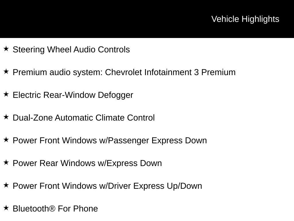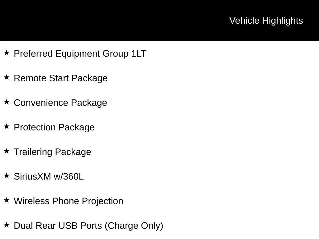 Silverado 1500 LT, 4D Crew Cab, EcoTec3 5.3L V8, 10-Speed Automatic, 4WD, Black, Jet Black Cloth, 10-Way Power Driver Seat w/Lumbar, 12.3 Multicolor Reconfigurable Digital Display, 120-Volt Bed Mounted Power Outlet, 120-Volt Instrument Panel Power Outlet, 6 Rectangular Chrome Tubular Assist Steps (LPO), All-Star Edition, Apple CarPlay/Android Auto, Auto-Locking Rear Differential, Bluetooth® For Phone, Chevrolet Connected Access Capable, Chevytec Spray-On Black Bedliner, Chrome Mirror Caps, Color-Keyed Carpeting Floor Covering, Compass, Convenience Package, Deep-Tinted Glass, Dual Rear USB Ports (Charge Only), Dual-Zone Automatic Climate Control, Electric Rear-Window Defogger, Electrical Steering Column Lock, Electronic Cruise Control, EZ Lift Power Lock & Release Tailgate, Front Frame-Mounted Black Recovery Hooks, Front Rubberized Vinyl Floor Mats, HD Rear Vision Camera, Heated Driver & Front Outboard Passenger Seats, Heated front seats, Heated Power-Adjustable Outside Mirrors, Heated Steering Wheel, Hitch Guidance, Inside Rear-View Mirror w/Tilt, Keyless Open & Start, LED Cargo Area Lighting, OnStar & Chevrolet Connected Services Capable, Power Front Windows w/Driver Express Up/Down, Power Front Windows w/Passenger Express Down, Power Rear Windows w/Express Down, Preferred Equipment Group 1LT, Premium audio system: Chevrolet Infotainment 3 Premium, Protection Package, Rear 60/40 Folding Bench Seat (Folds Up), Rear Rubberized-Vinyl Floor Mats, Rear Wheelhouse Liners, Remote keyless entry, Remote Start Package, Remote Vehicle Starter System, SiriusXM w/360L, Standard Tailgate, Steering Wheel Audio Controls, Theft Deterrent System (Unauthorized Entry), Trailering Package, Wheels: 17 x 8 Bright Silver Painted Aluminum, Wi-Fi Hot Spot Capable, Wireless Phone Projection, Wrapped Steering Wheel, 170 Amp Alternator, 220 Amp Alternator, 3.23 Rear Axle Ratio, 4-Wheel Disc Brakes, 40/20/40 Front Split-Bench Seat, 6 Speakers, 6-Speaker Audio System, ABS brakes, Air Conditioning, All-Weather Floor Liner (LPO), Alloy wheels, AM/FM radio: SiriusXM with 360L, Auto High-beam Headlights, Automatic Emergency Braking, Automatic temperature control, Auxiliary External Transmission Oil Cooler, Brake assist, Bumpers: chrome, Cloth Seat Trim, Delay-off headlights, Deleted 3 Years of Remote Access, Driver door bin, Driver vanity mirror, Dual front impact airbags, Dual front side impact airbags, Electronic Stability Control, External Engine Oil Cooler, Following Distance Indicator, Forward Collision Alert, Front anti-roll bar, Front Center Armrest w/Storage, Front dual zone A/C, Front License Plate Kit, Front Pedestrian Braking, Front reading lights, Front wheel independent suspension, Fully automatic headlights, Heated door mirrors, Heated steering wheel, Illuminated entry, IntelliBeam Automatic High Beam On/Off, Lane Keep Assist w/Lane Departure Warning, Low tire pressure warning, Not Equipped w/Steering Column Lock, Occupant sensing airbag, Outside temperature display, Overhead airbag, Overhead console, Panic alarm, Passenger door bin, Passenger vanity mirror, Power door mirrors, Power driver seat, Power steering, Power windows, Radio data system, Radio: Chevrolet Infotainment 3 Premium System, Rear reading lights, Rear step bumper, Rear window defroster, Security system, Speed control, Speed-sensing steering, Split folding rear seat, Standard Suspension Package, Steering wheel mounted audio controls, Tachometer, Telescoping steering wheel, Tilt steering wheel, Traction control, Trip computer, Variably intermittent wipers, Voltmeter, Silverado 1500 LT, 4D Crew Cab, EcoTec3 5.3L V8, 10-Speed Automatic, 4WD, Black, Jet Black Cloth, 10-Way Power Driver Seat w/Lumbar, 12.3 Multicolor Reconfigurable Digital Display, 120-Volt Bed Mounted Power Outlet, 120-Volt Instrument Panel Power Outlet, 6 Rectangular Chrome Tubular Assist Steps (LPO), All-Star Edition, Apple CarPlay/Android Auto, Auto-Locking Rear
