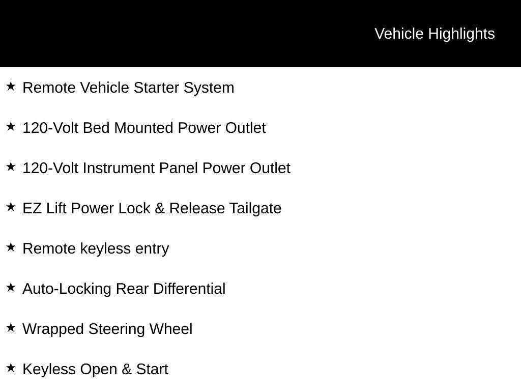 - Convenience Package includes (CJ2) dual-zone automatic climate control, (A2X) 10-way power driver seat including power lumbar, (KA1) heated driver and passenger seats, (N57) wrapped steering wheel, (KI3) heated steering wheel, (KI4) 120-volt power outlet, (KC9) 120-volt bed-mounted power outlet, (UBI) 2 charge-only USB ports for second row, (C49) rear-window defogger, (AVJ) Keyless Open and Start, (BTV) Remote Start and (UTJ) content theft alarm. (Upgradeable to (A50) bucket seats and includes (D07) center console.) (Upgradeable to (A50) bucket seats and includes (D07) center console. Deleted when (RG4) Fleet LT Base Content Package Delete is ordered.)