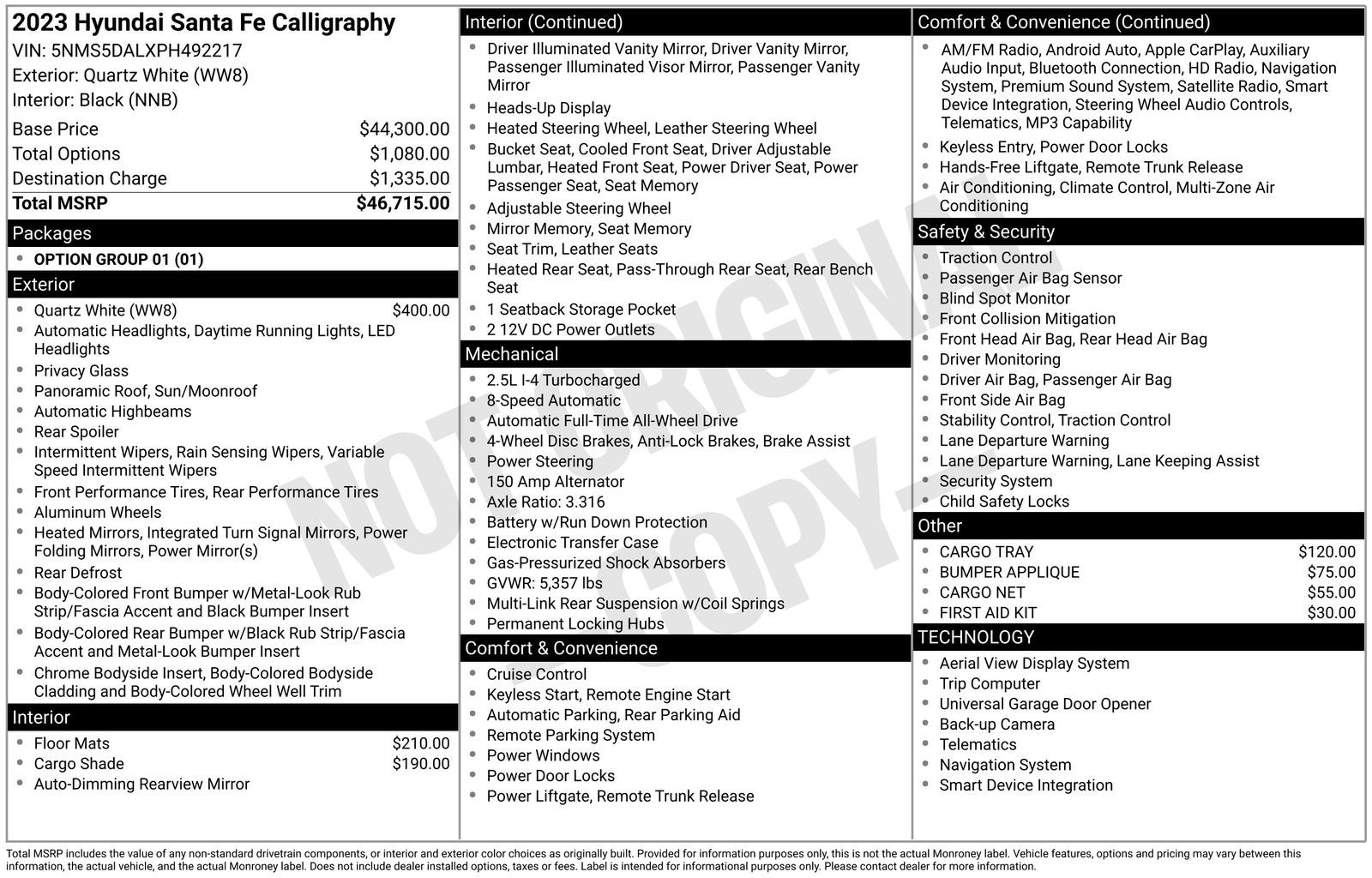 Elevate your driving experience with this stunning 2023 Hyundai Santa Fe Calligraphy. Boasting a powerful 2.5L I4 engine paired with Shiftronic all-wheel drive, this SUV delivers exceptional performance and efficiency, with an impressive 21 city/28 highway MPG.
