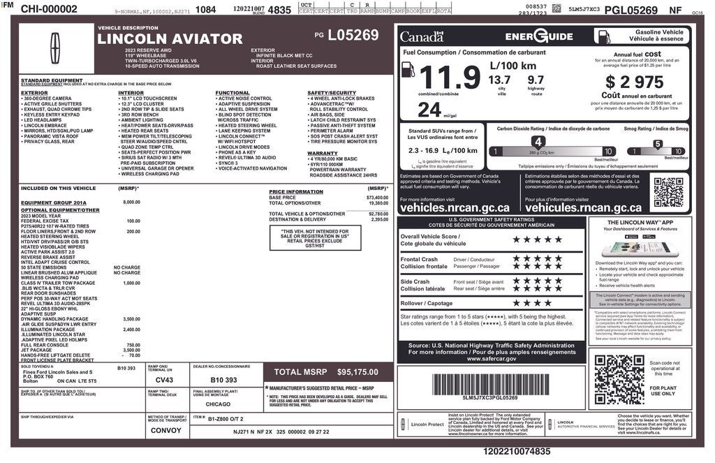 Infinite Black Metallic Clearcoat 2023 Lincoln Aviator Reserve AWD 10-Speed Automatic 3.0L V6 Low Miles!!!, Apple CarPlay/Android Auto, Clean CarFax!!!!, Aviator Reserve, 4D Sport Utility, 3.0L V6, AWD, Infinite Black Metallic Clearcoat, Roast w/Premium Lthr Heated/Ventilated Fnt Captain's Chairs, 3rd row seats: split-bench, 4-Pin & 7-Pin Connectors, Adaptive Pixel LED Headlamps, Adaptive suspension, Air Glide Suspension w/Dynamic Lower Entry, AM/FM radio: SiriusXM, Auto High-beam Headlights, Automatic temperature control, Black Exterior Elements, Blind Spot Information System, Body-Color Exterior Elements, Brake assist, Class IV Hitch & Wiring, Class IV Trailer Tow Package, Dynamic Handling Package, Electronic Stability Control, Four wheel independent suspension, Front dual zone A/C, Fully automatic headlights, Heated front seats, Heated VisioBlade Wipers, Heated/Ventilated 2nd Row Outboard Seats, HVAC memory, Illuminated Lincoln Star in Grille, Illumination Package, Jet Package, LED Fog Lamps, Memory seat, Navigation System, Power driver seat, Power Liftgate, Power moonroof: Panoramic Vista Roof, Power passenger seat, Premium Lthr Heated/Ventilated Fnt Captain's Chairs, Radio: Revel AM/FM Audio System w/14 Speakers, Rain sensing wipers, Rear air conditioning, Rear dual zone A/C, Remote keyless entry, Security system, SiriusXM Radio, Smart Trailer Tow, Speed control, Speed-Sensitive Wipers, Steering wheel memory, Steering wheel mounted A/C controls, Steering wheel mounted audio controls, SYNC 3 Communication & Entertainment System, Traction control, Trailer Sway Control, Turn signal indicator mirrors, Variably intermittent wipers, Wheels: 22 Black Aluminum.
