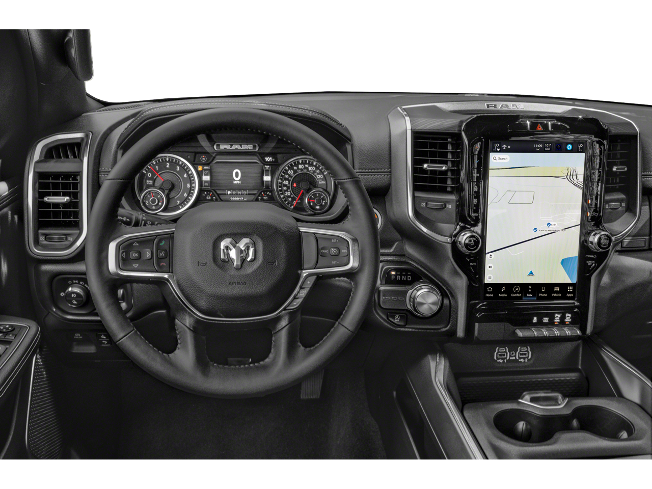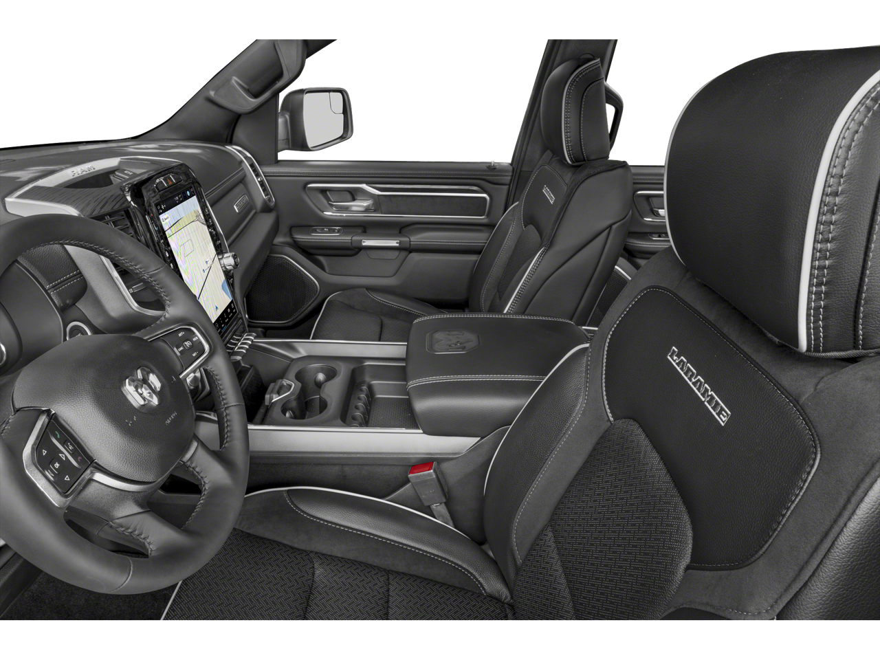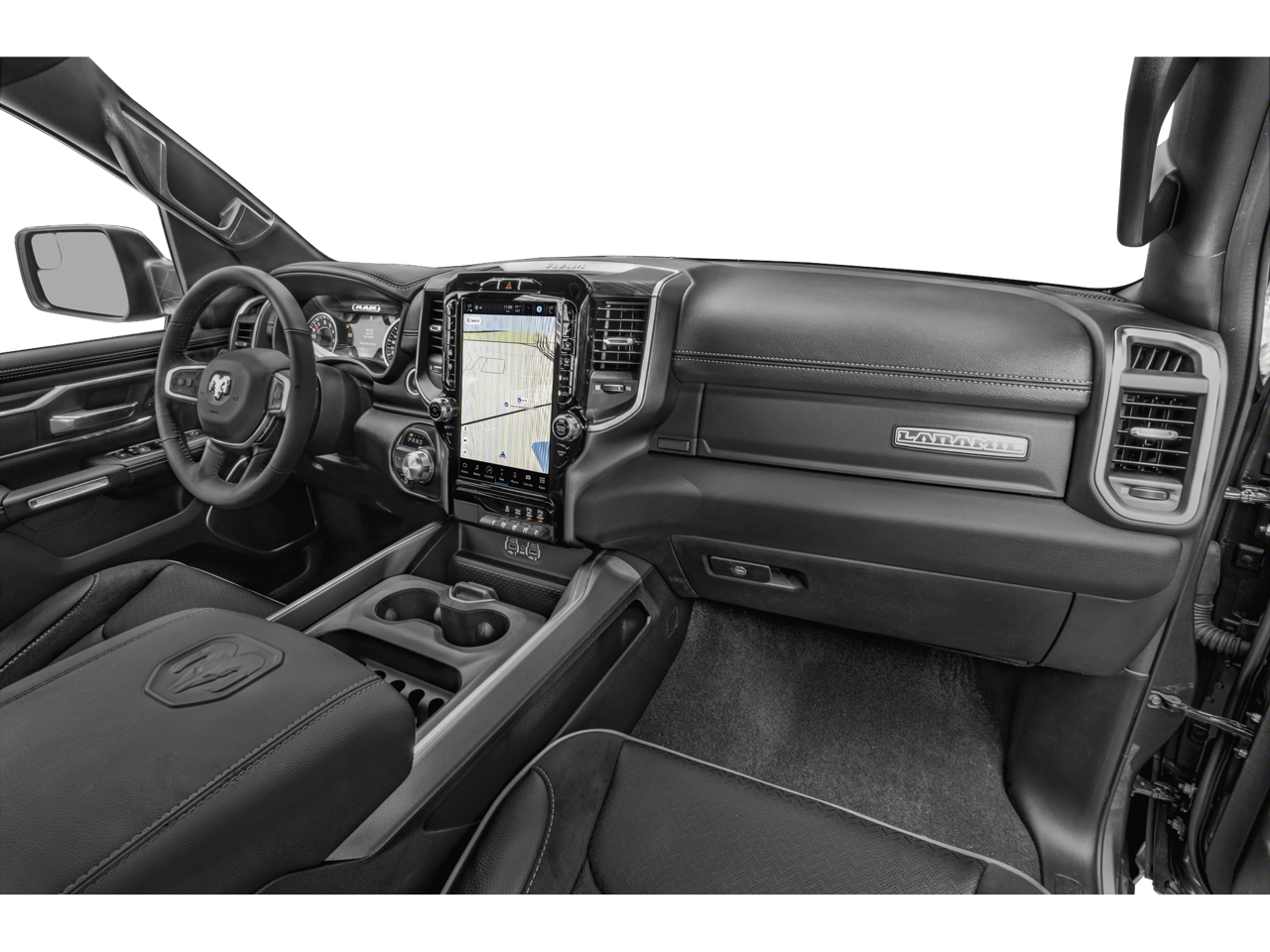 ** LEATHER **, ** PANO ROOF **, 1500 Laramie, 4D Crew Cab, HEMI 5.7L V8 Multi Displacement VVT eTorque, 8-Speed Automatic, 4WD, Bright White Clearcoat, Black w/Premium Leather Trimmed Bucket Seats, 12 Touchscreen Display, 2nd Row In Floor Storage Bins, 4G LTE Wi-Fi Hot Spot, Apple CarPlay, Apple CarPlay/Android Auto, Auto High Beam Headlamp Control, Black Interior Accents, Blind Spot & Cross Path Detection, Body Color Exterior Mirrors, Body Color Front Bumper, Body Color Premium Power Mirrors, Body Color Rear Bumper w/Step Pads, Class IV Receiver Hitch, Connected Travel & Traffic Services, Connectivity - US/Canada, Disassociated Touchscreen Display, Electric Shift-On-Demand Transfer Case, Foam Bottle Insert (Door Trim Panel), For Details, Visit DriveUconnect.com, For More Info, Call 800-643-2112, Front Door Accent Lighting, Front LED Fog Lamps, Global Telematics Box Module (TBM), Google Android Auto, GPS Antenna Input, GPS Navigation, Grille Surround 3 Body Color Tex 2 Black, HD Radio, Heated front seats, Integrated Center Stack Radio, Integrated Voice Command w/Bluetooth®, Laramie Level 1 Equipment Group, LED Reflector Headlamps, Navigation System, ParkSense Front/Rear Park Assist w/Stop, Power 8-Way Driver & Passenger Seats, Radio: Uconnect 5 Nav w/12.0 Display, Rain Sensitive Windshield Wipers, RAM Grille Badge - Chrome, Rear Door Accent Lighting, Rear Power Sliding Window, Rear Window Defroster, Remote Tailgate Release, SiriusXM Radio Service, SiriusXM w/360L, Sport Appearance Package, Sport Decal, Sport Performance Hood, USB Host Flip, Wheels: 20 x 9 Premium Painted w/Inserts, #1 Seat Foam Cushion, 10 Speakers, 3 Rear Seat Head Restraints, 3.21 Rear Axle Ratio, 4 Way Front Headrests, 4-Wheel Disc Brakes, 48V Belt Starter Generator, ABS brakes, Adjustable pedals, Air Conditioning, Alloy wheels, AM/FM radio: SiriusXM with 360L, Anti-Spin Differential Rear Axle, Audio memory, Auto-dimming door mirrors, Auto-Dimming Exterior Driver Mirror, Auto-dimming Rear-View mirror, Automatic temperature control, Brake assist, Bumpers: chrome, Chrome Exterior Mirrors, Compass, Convex Wide-Angle Exterior Mirror Insert, Delay-off headlights, Dome Dual LED Reading Lamp, Driver door bin, Driver Seat Memory, Driver vanity mirror, Dual front impact airbags, Dual front side impact airbags, Dual-Pane Panoramic Sunroof, Electronic Stability Control, Exterior Mirrors Courtesy Lamps, Exterior Mirrors w/Heating Element, Exterior Mirrors w/Memory, Exterior Mirrors w/Supplemental Signals, Front anti-roll bar, Front Center Armrest w/Storage, Front dual zone A/C, Front fog lights, Front reading lights, Front Seat Back Map Pockets, Front wheel independent suspension, Fully automatic headlights, Garage door transmitter, Heated door mirrors, Heated Front Seats, Heated Steering Wheel, Heated steering wheel, Illuminated entry, Leather steering wheel, Leather Trim 40/20/40 Bench Seat, LED Dome/Reading Lamp, Low tire pressure warning, Manufacturer's Statement of Origin, Memory seat, MOPAR Front & Rear Rubber Floor Mats, Occupant sensing airbag, Outside temperature display, Overhead airbag, Overhead console, Panic alarm, ParkSense Front/Rear Park Assist w/Stop (DISC), ParkView Rear Back-Up Camera, Passenger door bin, Passenger vanity mirror, Pedal memory, Power 2-Way Driver Lumbar Adjust, Power 2-Way Passenger Lumbar Adjust, Power door mirrors, Power driver seat, Power passenger seat, Power steering, Power windows, Power-Folding Mirrors, Quick Order Package 27H Laramie, Radio data system, Radio: Uconnect 5 Nav w/8.4 Display, Rear 60/40 Folding Seat, Rear anti-roll bar, Rear seat center armrest, Rear step bumper, Rear Underseat Compartment Storage, Rear Wheelhouse Liners, Remote keyless entry, Security system, Speed control, Split folding rear seat, Steering wheel mounted audio controls, Tachometer, Telescoping steering wheel, Tilt steering wheel, Traction control, Trailer Brake Contro