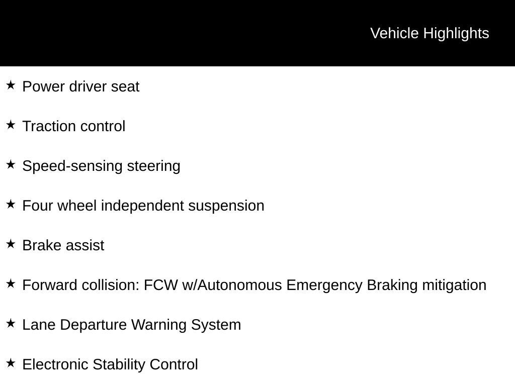 - Forward collision: FCW w/Autonomous Emergency Braking mitigation